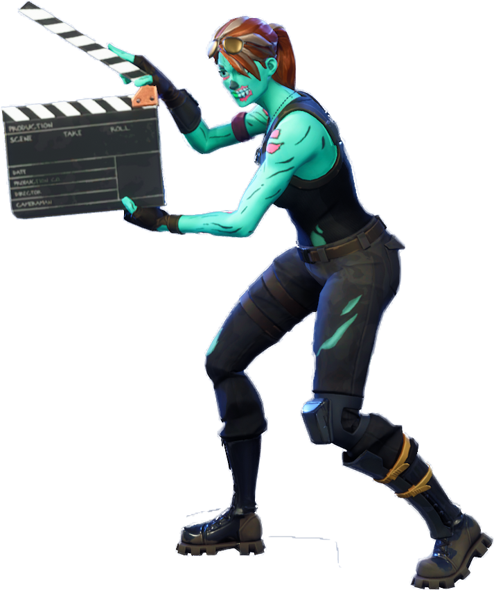 The image displays a person , likely a character from a video game , who is holding a movie clapperboard or film slate. The character is posed in an energetic manner, likely acting or directing the scene . The scene appears to be lit with blue and green lights, which adds a touch of creativity to the image .