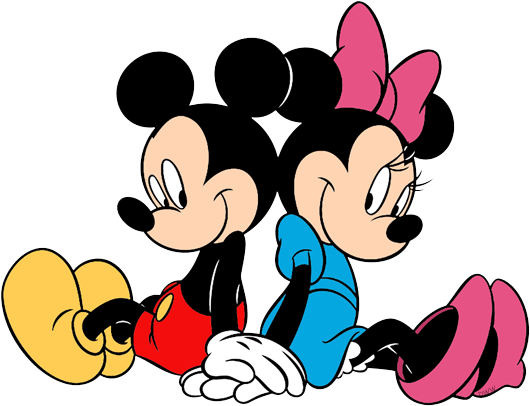 The image features two Mickey Mouse characters sitting close to each other , seemingly embracing each other . One of the m has a pink bow on their head , while the other Mickey Mouse is wearing a blue bow. They appear to be sharing a tender moment, possibly greeting each other or sharing a kiss.