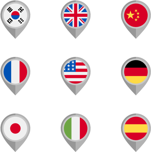 The image shows a collection of nine different country flags displayed on pin icons. These flags are positioned in various locations, covering different sections of the image.