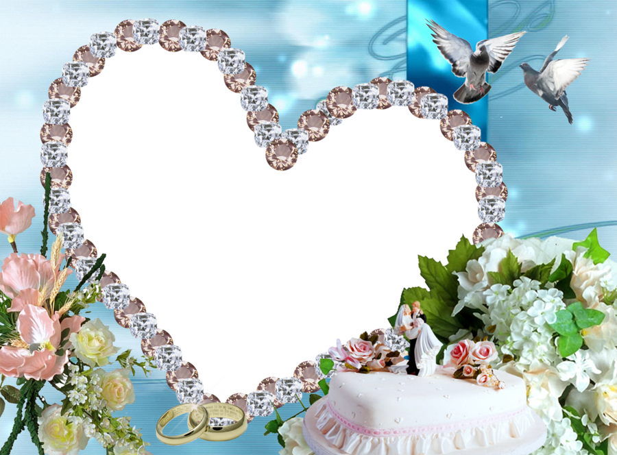 The image displays two heart-shaped photo frames surrounded by various wedding items. Inside the heart -shaped frames, there are wedding rings placed, with two visible rings on each side of the frame. The scene also features two doves flying, one towards the upper right corner and another towards the lower left part of the image. The doves’ presence suggests that they are part of the wedding ceremony or decoration.