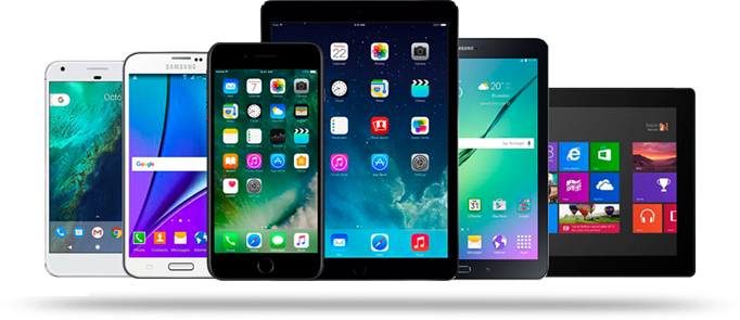 The image shows a variety of different smart devices, including smartphones and tablets, all displaying various icons and apps. The phones are displayed side by side , showcasing their designs and features. The tablets are arranged in a row , showcasing their designs and applications.